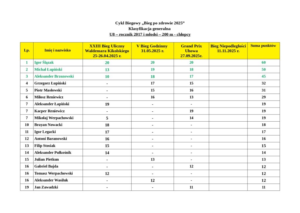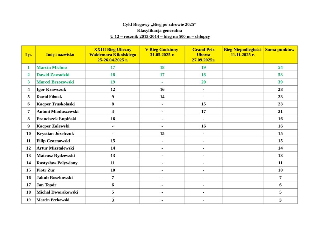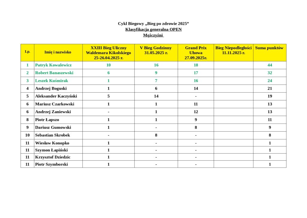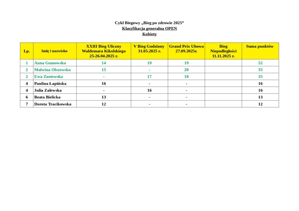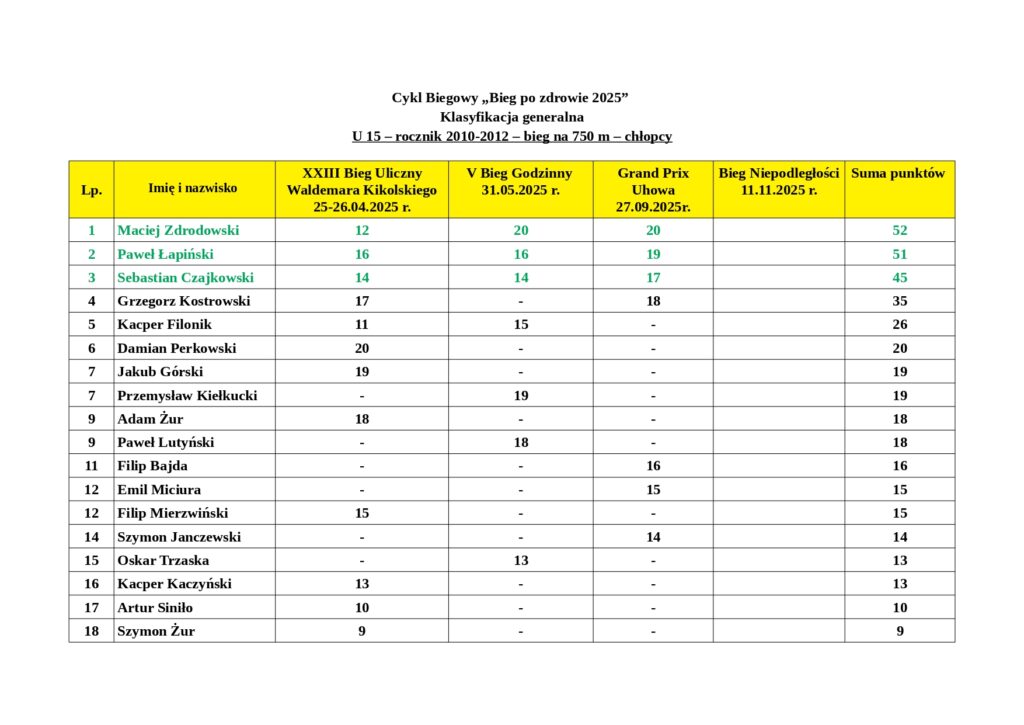 Wyniki podsumowują punkty zdobyte przez mieszkańców naszej gminy po XXIII Biegu Ulicznym im. Waldemara Kikolskiego, V Biegu Godzinnym oraz III Grand Prix Uhowa.