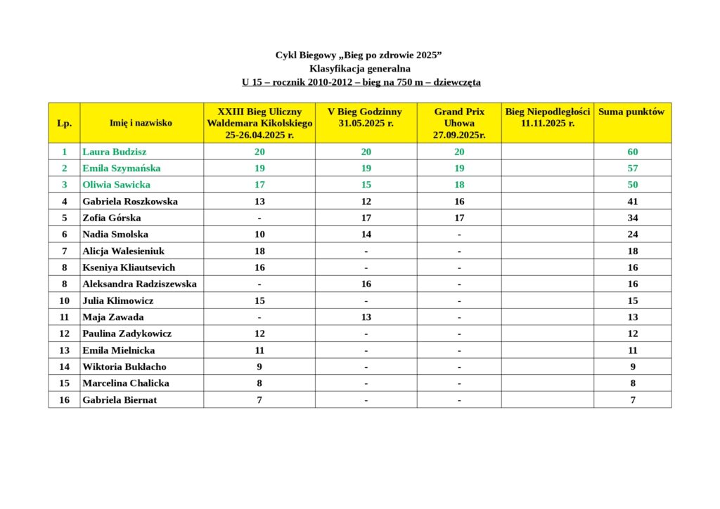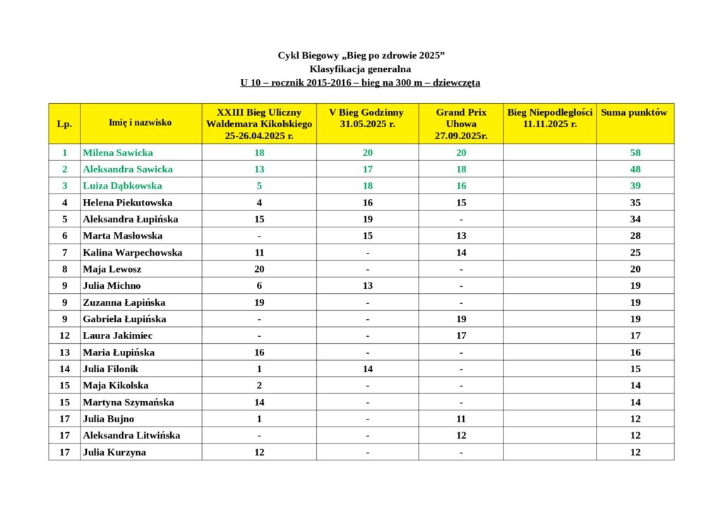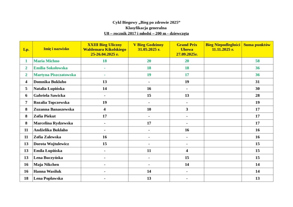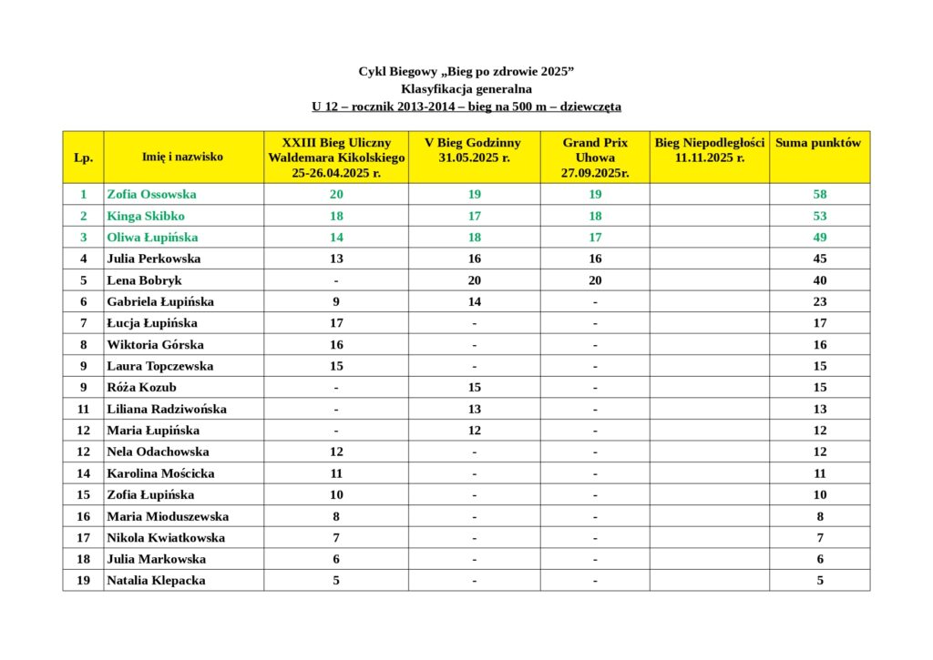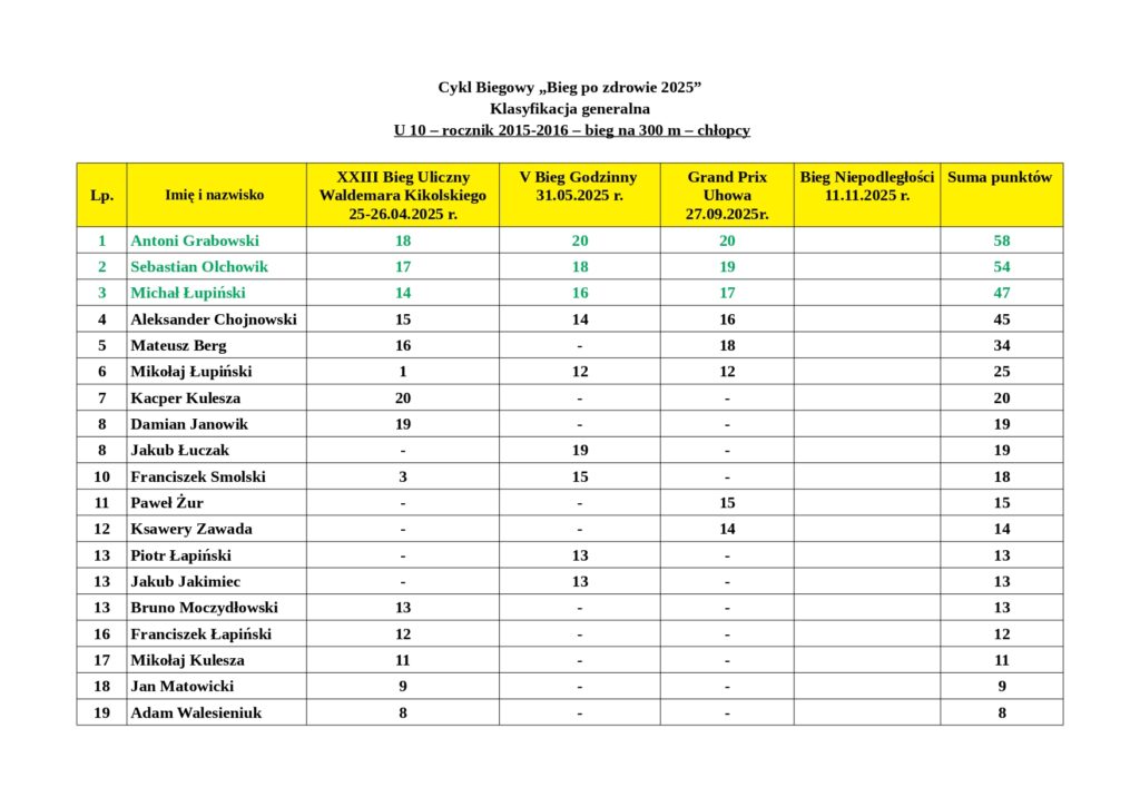 Wyniki podsumowują punkty zdobyte przez mieszkańców naszej gminy po XXIII Biegu Ulicznym im. Waldemara Kikolskiego, V Biegu Godzinnym oraz III Grand Prix Uhowa.