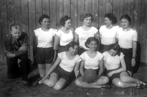 1937 r. Siatkarki KPW Łapy. Od góry: Leonard Pilchowski – trener, Maria Łapińska – Kisielewska, Helena Kunigielis – Pilchowska (przyszła żona p. Leonarda), Walentyna Mystkowska, Zofia Parolowa – Klam, Lidia Bućko – Porowska: niżej; Leonarda Gorbaczyńska – Bańkowska, Bronisława Spiżewska Janina Zawadzka – Ignatowicz,.